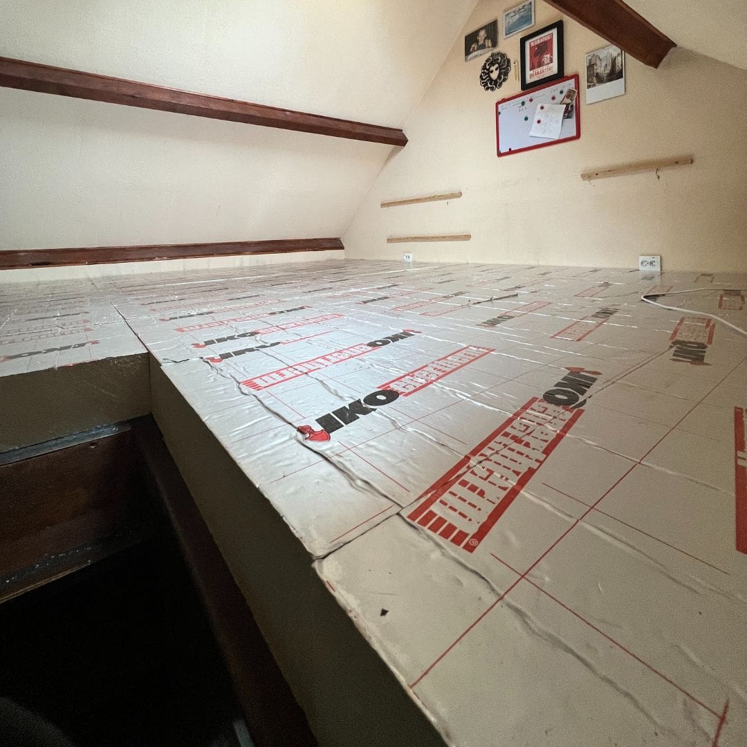 Pour cette intervention, nous avons choisi d’utiliser des panneaux en polyuréthane, un matériau reconnu pour ses excellentes performances thermiques et son faible impact environnemental. Ce choix d’isolant permet de réduire efficacement les déperditions de chaleur tout en maintenant une température stable dans le grenier, été comme hiver. De plus, les panneaux en polyuréthane offrent une résistance optimale à l’humidité, assurant ainsi une isolation durable et fiable.