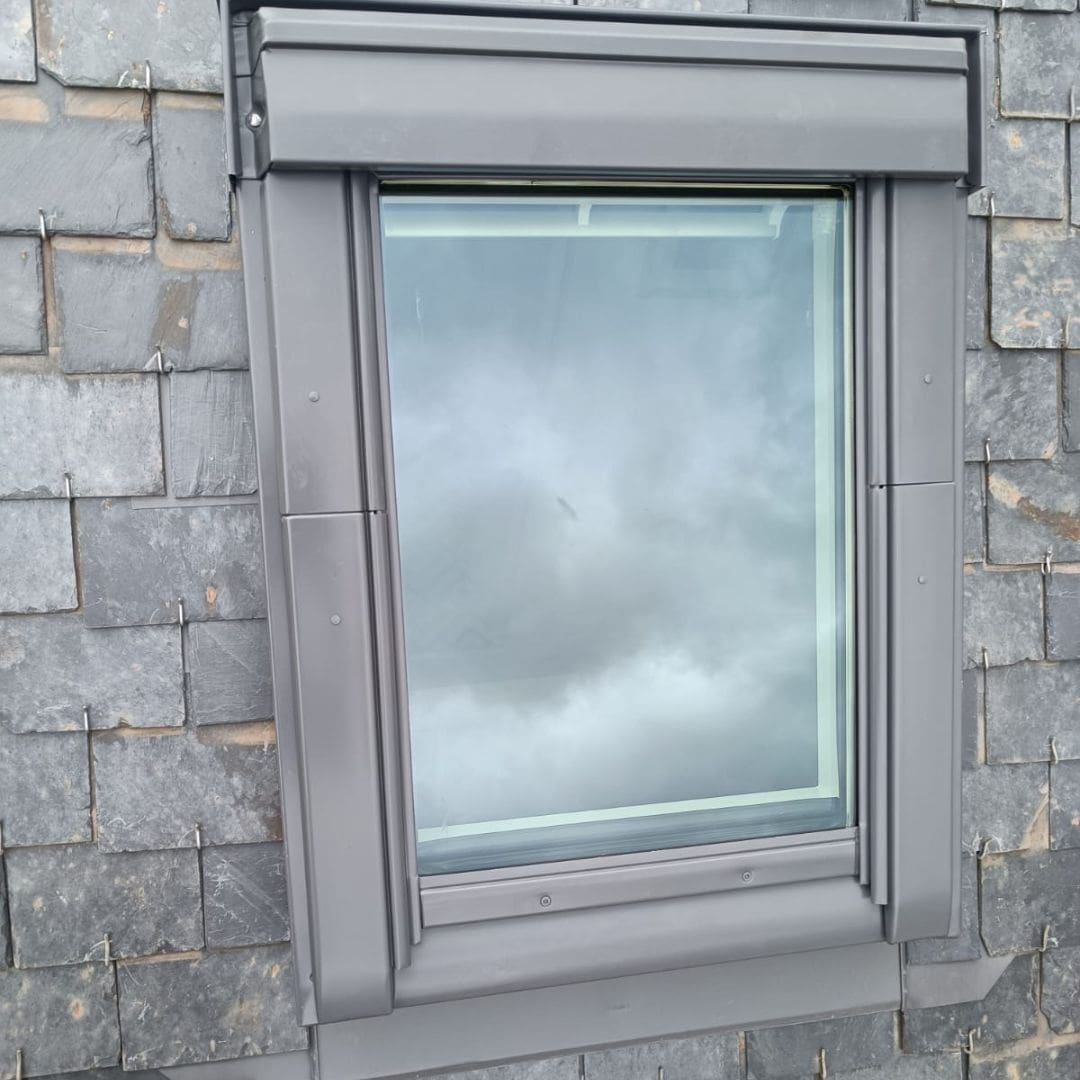Une fois l’espace prêt, nous installons le nouveau Velux en veillant à une fixation solide et sécurisée. Enfin, le nouveau raccord d’étanchéité est mis en place, et les ardoises sont réinstallées pour une finition impeccable et une intégration harmonieuse à la toiture.